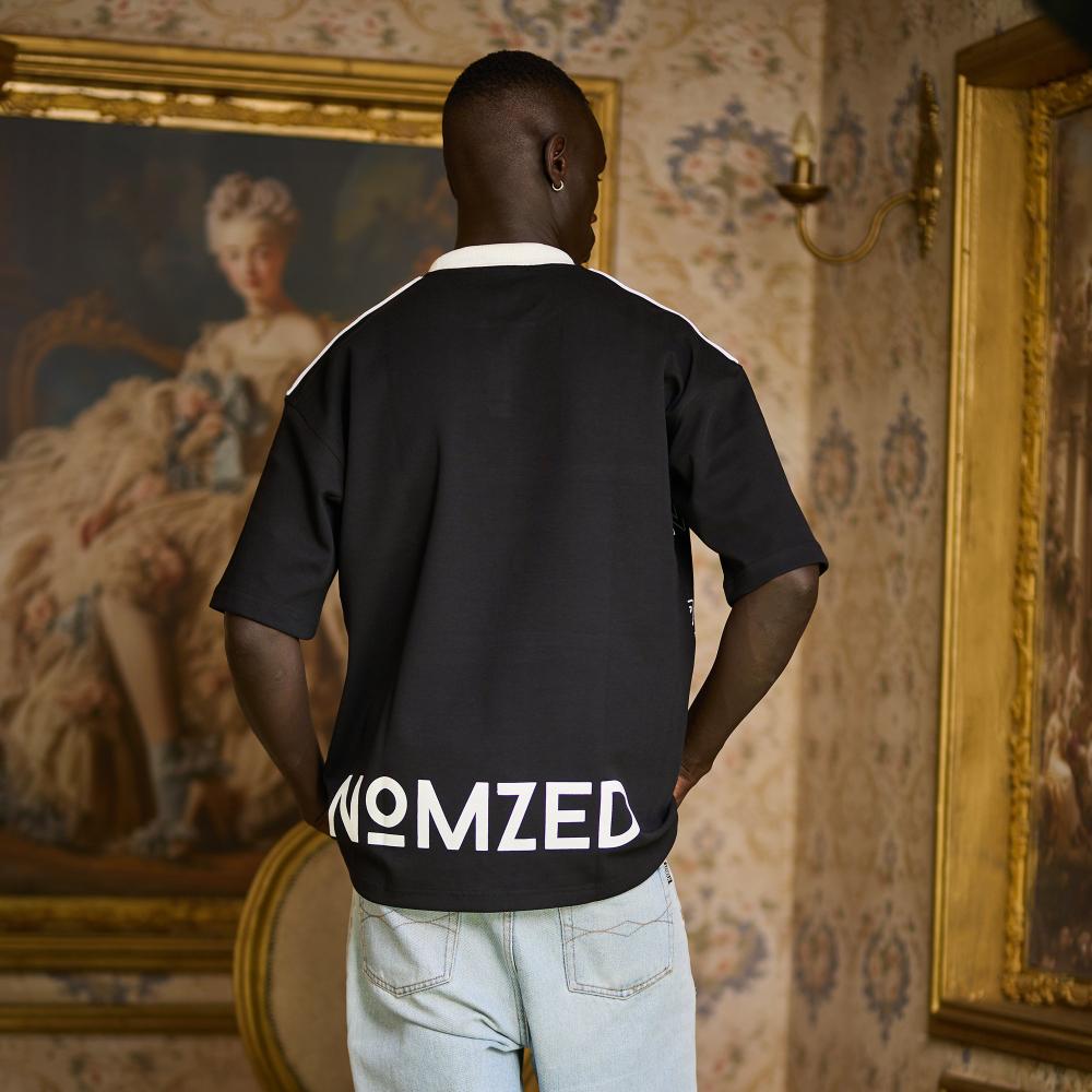 - تيشيرت صيفي نصف كم يأتي باللون الأسود الزاهي عليه كلمة " Nomzed" باللون الأخضر الفاتح مكتوبة بطريقة أنيقة.